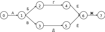 Критический путь: 0 - 1 - 2 - 4 - 6 - 7 Критическое время: 41 дней. |
