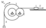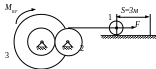 Механизм начинает двигаться из состояния покоя под действием заданных сил: постоянной силы F, постоянного вращающего момента Мвр и сил тяжести. Сила и момент действуют на одно из тел, как показано на рисунке. Зная массы тел m1, m2, m3, m4; радиусы r и R малых и больших окружностей колёс; радиусы инерции ступенчатых колёс ρ, определить какую скорость будет иметь тело 1 после того, как оно переместится на расстояние S=3м. Коэффициент трения скольжения для всех вариантов, где груз скользит по плоскости, f=0,05. Сопротивлением качению пренебречь. Качение колёс происходит без скольжения. Численные значения всех величин даны в таблице 3.2.