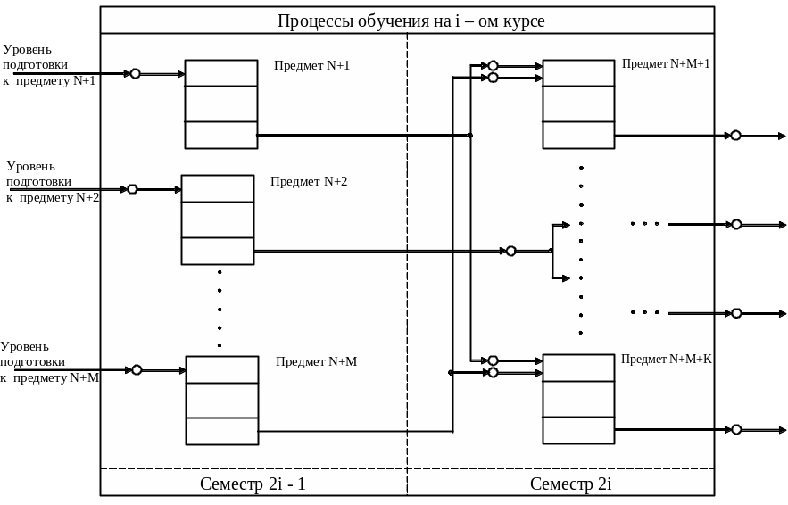Входом каждого процесса обучения студента по конкретному предмету является уровень подготовленности студента к изучению этого предмета, сформированный на предыдущих курсах университета и при довузовском обучении. Кружочками обозначены интерфейсы взаимодействия преподавателей, являющихся владельцами процессов обучения на различных курсах университета.