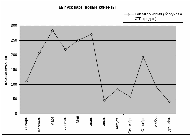 В целом же Филиал Банка «Россбанк» (ОАО) в г. Хабаровске на протяжении всего 2004 года выпускал пластиковые карты в обращение. При чем произведен анализ эмиссии карт для новых клиентов и без учета карт STB-кредит. То есть можно отметить, что Филиал Банка «Россбанк» (ОАО) в г. Хабаровске активно эмитирует банковские карты.