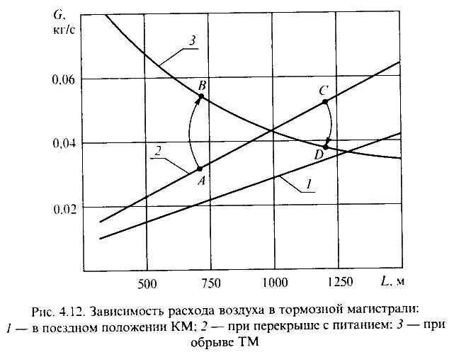 С переходом на тепловую и электрическую тягу длина поездов возросла до 1000 м и более. Для управления тормозами в этом случае, особенно для отпуска, пришлось расширить питающее отверстие КМ до 13 мм (№ 222, 394). При обрыве поезда в хвостовой части в этом случае, (см. рис.), расход воздуха даже несколько снижается (точки Р и D).