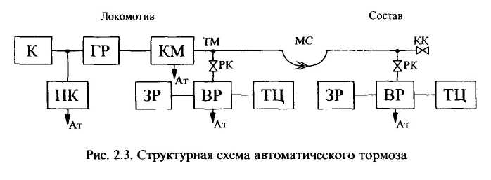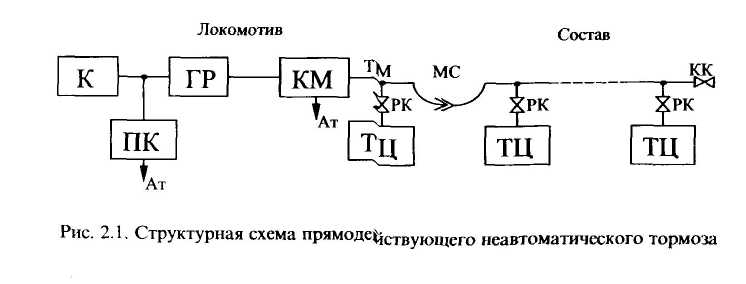 - •33 Структурные схемы неавтоматического и автоматического прямодействующих тормозов, их особенности и диаграммы изменения давления в тм и тц.