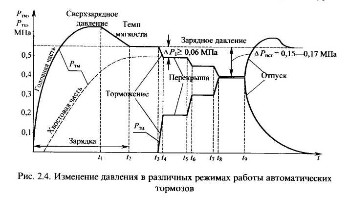 Разрядка ТМ более чем на 0,15...0,17 МПа нецелесообразна, т.к. максимальный тормозной эффект при этом уже достигается. Минимальное давление в ЗР должно быть не менее 0,45 МПа. С учетом длины поезда и утечек в ТМ следующие уровни зарядного давления: 0,53...0,55 МПа – груж поезд норм длины; 0,50...0,52 МПа – пасс поезда; 0,45...0,48 МПа – МВС.