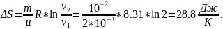 В сосуде находится водород массой m = 10 г. При изотермическом расширении объем водорода увеличивается в два раза. Считая водород идеальным газом, найти приращение его энтропии.