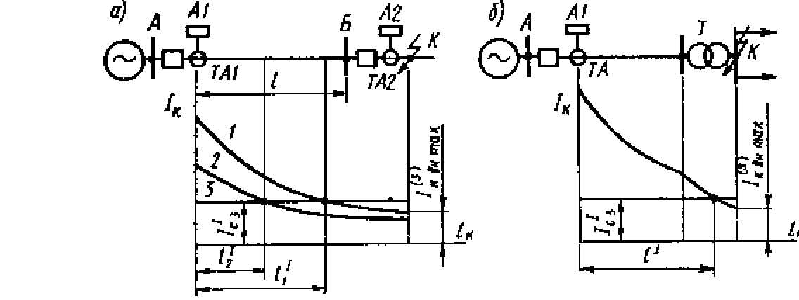 Уақыт ұстамалығынсыз токкесер. Токтық қорғаныстың бірінші сатыдағы (келесіде біз оны токкесер деп атаймыз) талғаулылық әсері оның іске қосылудағы ҚТ-дың максималь тогынан жоғары қабылдау арқылы қол жеткізеді. Қысқа тұйықталу кезінде қорғаныстың әрекеті, тораптағы ҚТ-дың, сондай-ақ қорғаныстағы да қысқа тұйықталу тогының қорек көзіне жақындаған сайын өсуімен, қамтамасыз етіледі (8.3 сурет). 8.3,а суретте 1 және 2 қисықтар қысқа тұйықталу тогының максималь және минималь режімдегі өзгеруін көрсетеді. Кейбір кездерде бір трансформаторды қоректенетін радиалдық желілердегі токкесер арқылы бүкіл желіні қорғауға болады, егерде оның іске қосылуын трансформатордағы зақымдануларды ұйғарсақ (8.3,б сурет).