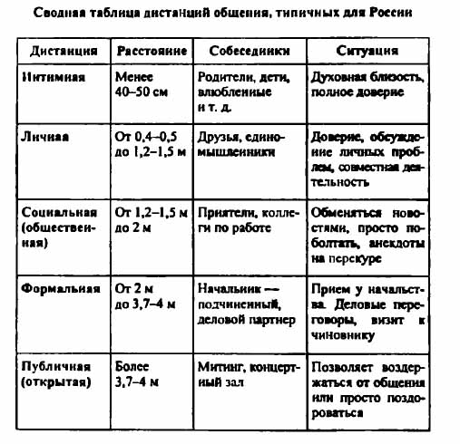 3) Ролевая игра «Дистанция». Смоделируйте диалоги в различных ситуациях общения. Один из игроков должен нарушать дистанцию общения, типичную для данной ситуации, другой – стремиться ее сохранить. (Обратитесь к таблице ниже). Для чего необходимо соблюдать дистанцию? Чем объясняются межкультурные различия проксемических особенностей коммуникации?