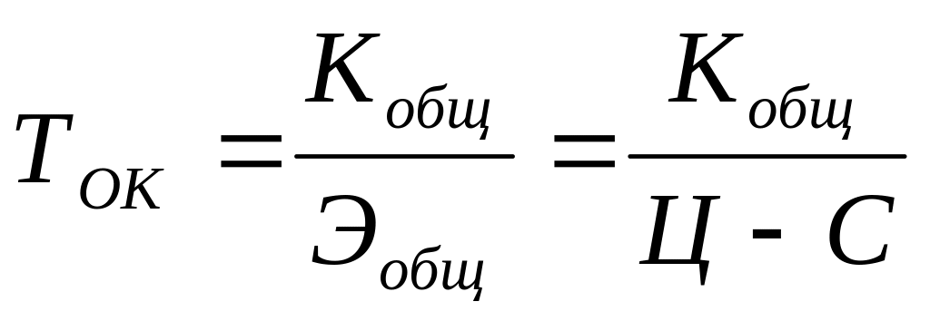 Важно знать не только коэффициент рентабельности, но и срок окупаемости капитальных вложений в производственные фонды. Расчет срока окупаемости Ток производится на основе обратного соотношения полных капитальных вложений и экономического эффекта (прибыли) по выражению:
