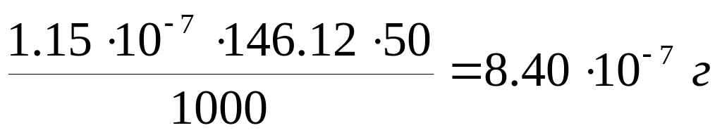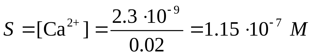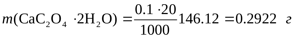 б) При использовании полуторного избытка осадителя масса осадка остается практически неизменной 0,2922 г СаС2О4Н2О. Объем раствора после осаждения равен 20+201,5=50 мл. При добавлении полуторного количества осадителя избыток его составляет 10 мл 0.1 М. Концентрация ионов С2О42– в полученном растворе будет составлять 0.110/50= 0.02 М. Поскольку в растворе находится избыток С2О42– растворимость СаС2О4 будет определяться концентрацией ионов кальция и