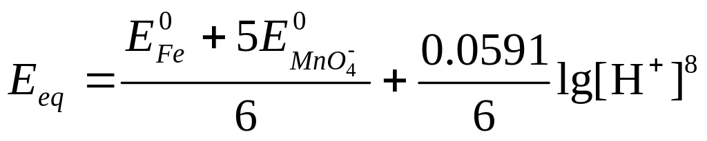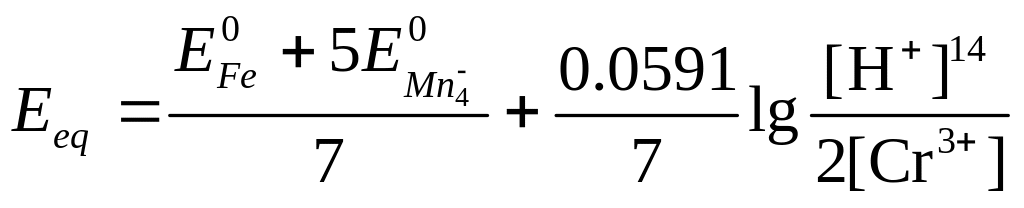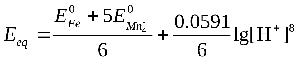 Потенциал в точке эквивалентности. В точке эквивалентности потенциал для данной реакции рассчитывают по уравнению