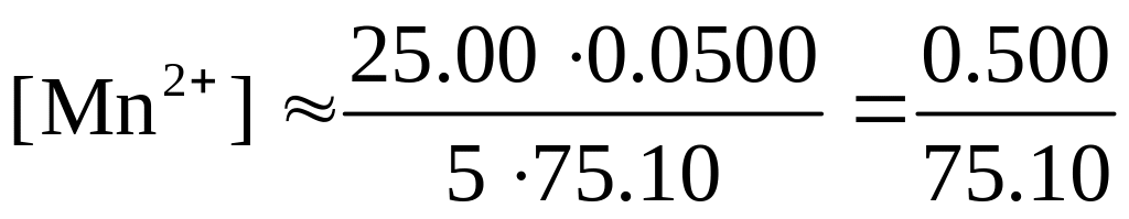 Потенциалы за точкой эквивалентности. Если добавлено 25,10 мл 0,1000 н. раствора KMnO4, то равновесные концентрации с учетом стехиометрии реакции равны: