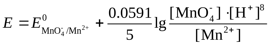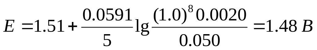 Следует заметить, что в уравнение Нернста входят молярные концентрации, а не нормальности растворов. В рассматриваемой реакции для частиц, содержащих марганец, молярность равна одной пятой нормальности раствора.