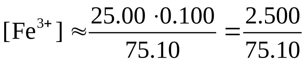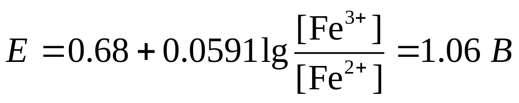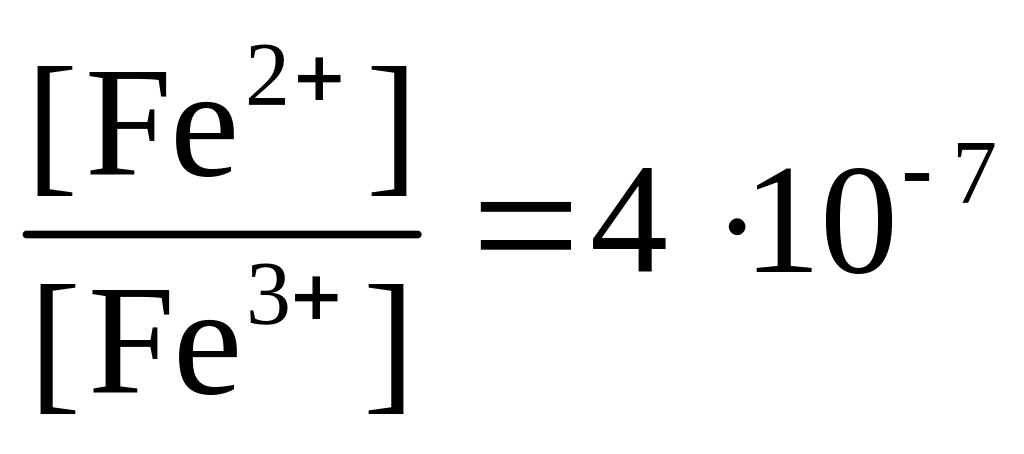 Второе уравнение в данном случае более удобно, поскольку входящие в него концентрации с приемлемым приближением известны. Подставляя в это уравнение равновесные концентрации железа (II) и железа(III), получаем