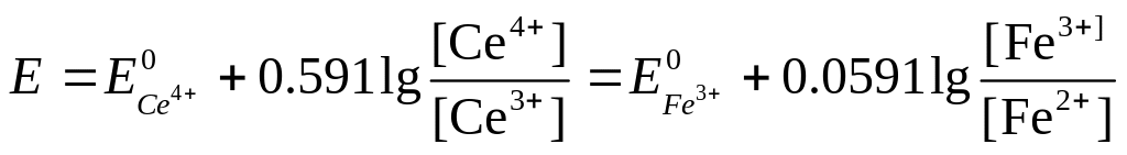 С точки зрения величины константы равновесия эти приближения вполне допустимы. Как и прежде, значение потенциала можно рассчитать по уравнению для системы железо (III) железо (II). Однако на этой стадии удобнее использовать потенциал системы церий(IV) церий(III), поскольку известны равновесные концентрации этих ионов. Поэтому