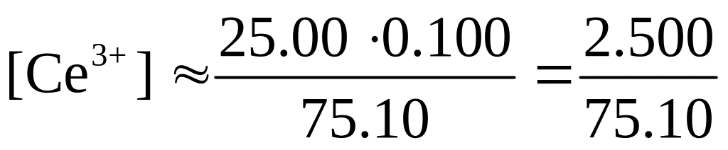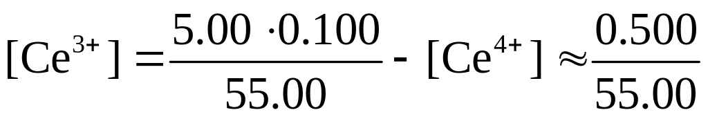 Равновесная концентрация церия(III) равна общей его концентрации за вычетом концентрации непрореагировавшего церия (IV):