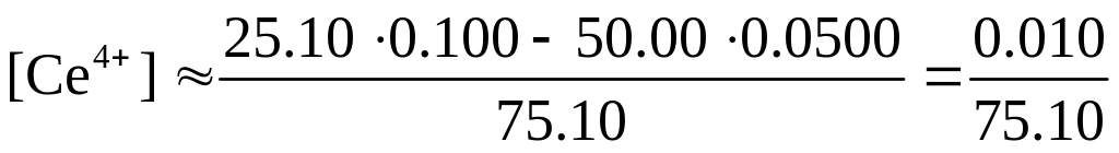 Пример 1. Рассчитайте концентрации реагентов и продуктов реакции в точке эквивалентности при титровании 0,100 н. раствора Fe2+ 0,100 н. раствором Се4+ при 25 °С, если оба раствора являются 1,0 М по H2SO4.