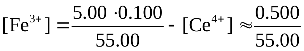 Ясно, что в точке эквивалентности большая часть Fe2+ превращена в Fe3+. С учетом разбавления можно сказать, что концентрация Fe3+ практически равна половине исходной концентрации Fe2+: