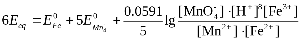 Для того чтобы при объединении выражений, стоящих под знаком логарифма, концентрации различных частиц сократились, уравнение полуреакции для перманганата необходимо умножить на 5 и сложить:
