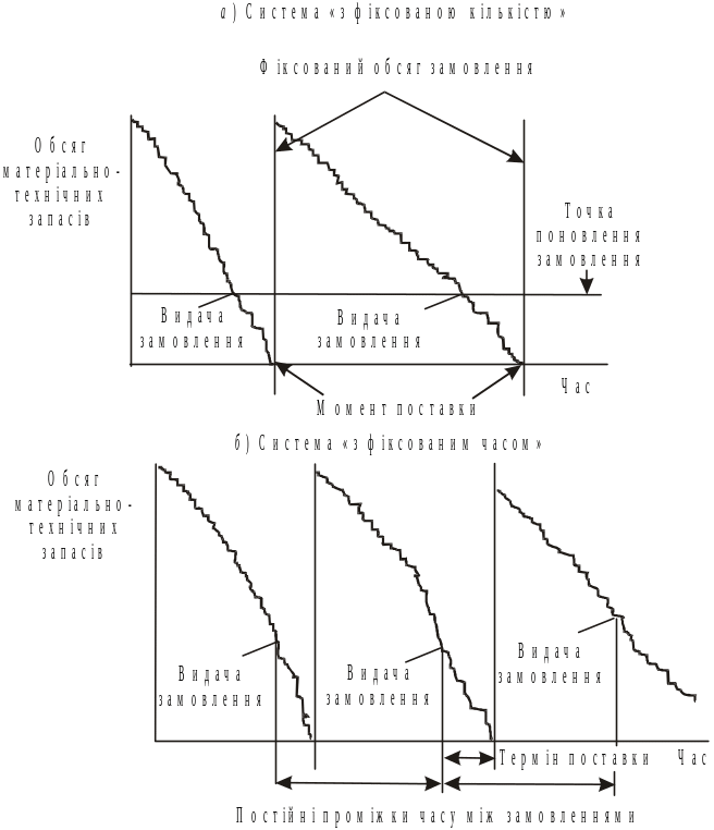 Техніка управління запасами. Основними системами управління запасами з незалежним попитом є система «з фіксованим часом» (періодичністю замовлення) та система «з фіксованою кількістю» (розміром замовлення). Графічна інтерпретація функціонування цих систем представлена на рис. 12.5.