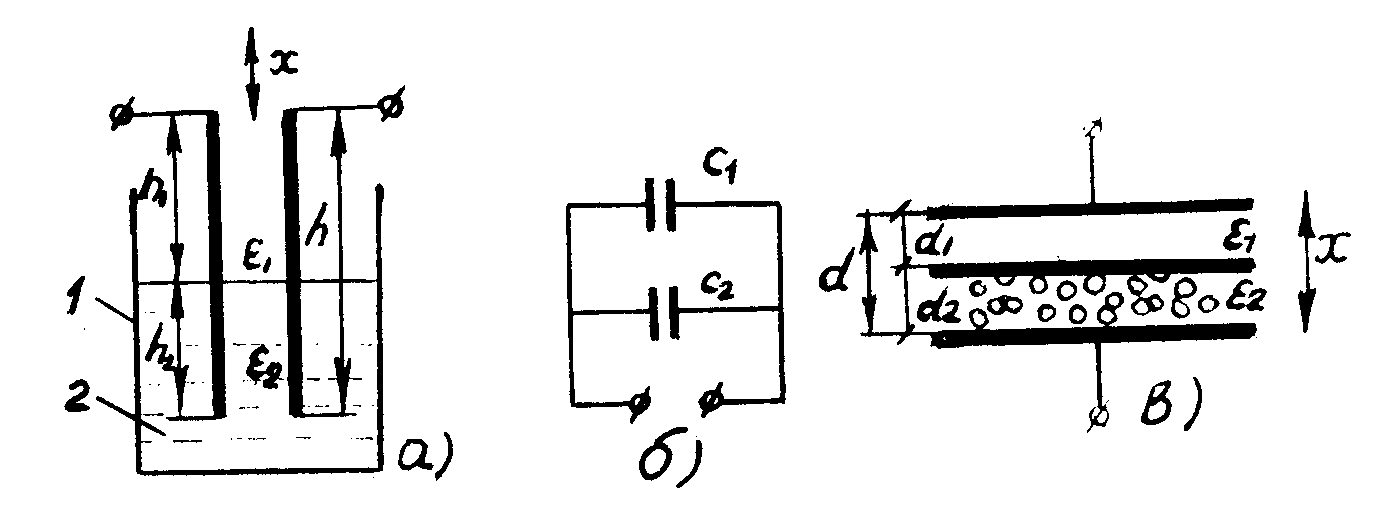При различных величинах диэлектрической проницаемости воздуха 1 = в и перемещающегося диэлектрика ε2 (жидкость) образуется два конденсатора C1 и C2, соединенные параллельно.