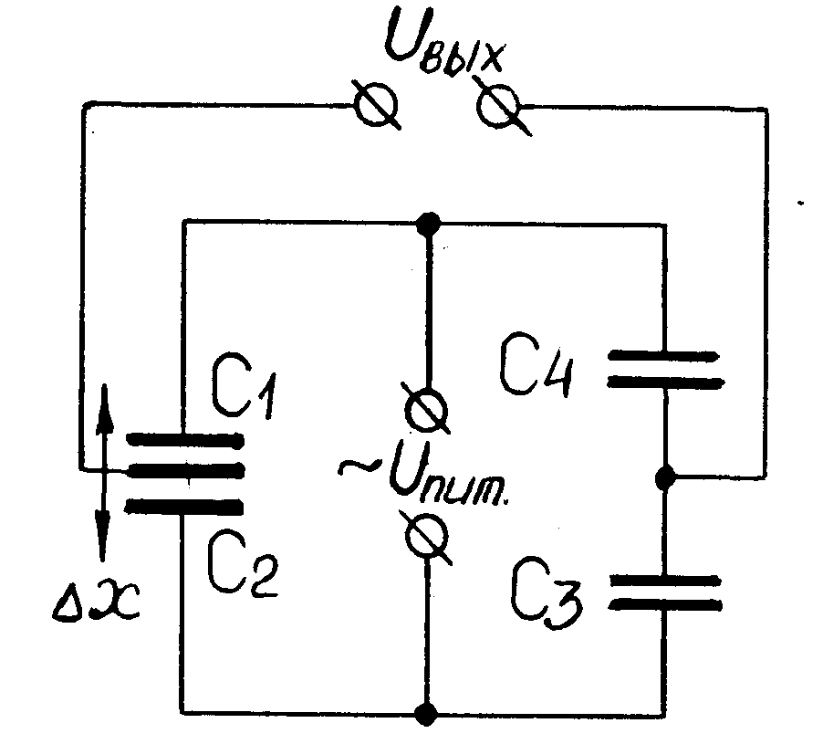 Мостовая схема емкостного ИП содержит два конденсатора постоянной емкости (С4 и С3) и трехэлектродный воздушный конденсатор со средней подвижной пластиной, перемещение которой вызывает изменение емкостей C1 и C2).