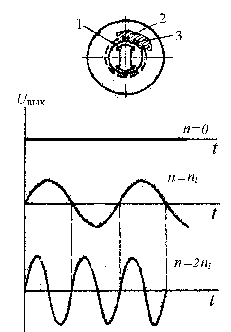 Тахогенератор состоит из статора 2, в пазах которого размещена обмотка 3, и якоря 1, представляющего собой магнит постоянного тока с несколькими полюсами. При вращении якоря в обмотке статора наводится переменная ЭДС, имеющая синусоидальную форму. Амплитуда и частота ЭДС пропорциональны скорости вращения якоря, что видно из рисунка 8.2.