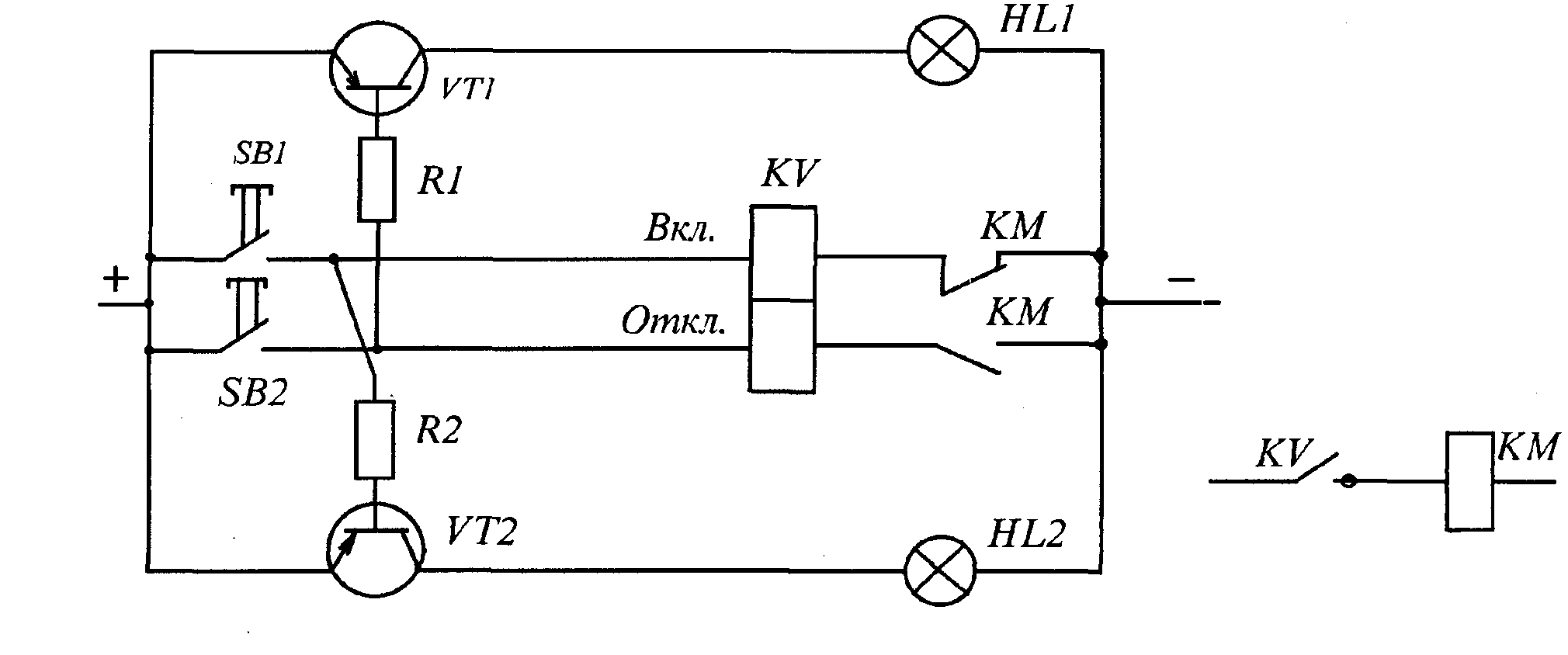 Поставленная цель может быть достигнута путем использования транзисторов VT1 и VT2, в коллекторную цепь которых включаются соответствующие сигнальные лампы HL1 и HL2. Ток контроля, протекающий по базе транзистора, на порядок ниже тока срабатывания включающей и отключающей обмотки реле KV, за счет введения в цепь сигнализации дополнительного сопротивления R1 и R2.
