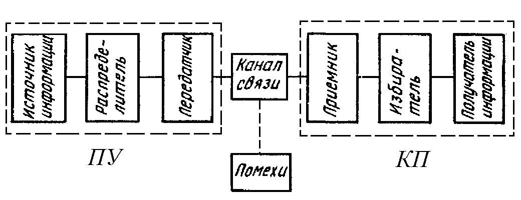 На рисунке 12.1 показана функциональная схема основных элементов системы телемеханики, в частности системы ТУ. Источник информации хранит и в соответствующее время выдает исходные данные, которые необходимо передавать на расстояние. Распределитель (шифратор) в определенной последовательности подключает к передатчику цепи, с которых снимаются сигналы-приказы. Передатчик преобразует сигналы в тот вид, который удобен для передачи их по КС. Канал связи обеспечивает передачу закодированных сигналов на требуемое расстояние. Приемник воспринимает закодированные сигналы из КС и преобразует их в вид, удобный для передачи в избиратель. Избиратель (дешифратор) выбирает из большого числа закодированных сигналов тот, который был послан от источника информации, и преобразует его в величину, удобную для приема получателем информации.