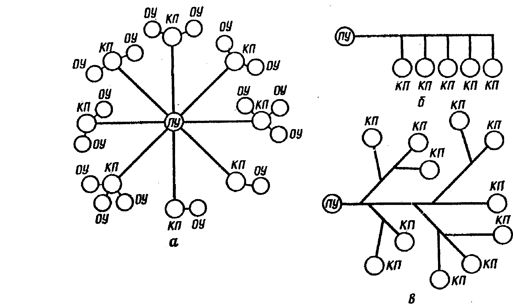 По структуре линий связи системы телемеханики могут быть (рисунок 12.2): радиальные, в которых каждый контролируемый пункт (КП) соединен с пунктом управления (ПУ) отдельной линией; цепочечные, обеспечивающие работу при последовательном или параллельном подключении КП к одной линии связи; с древовидной структурой линий связи, предусматривающие соединение ПУ с несколькими КП по произвольно разветвленной сети линий связи.