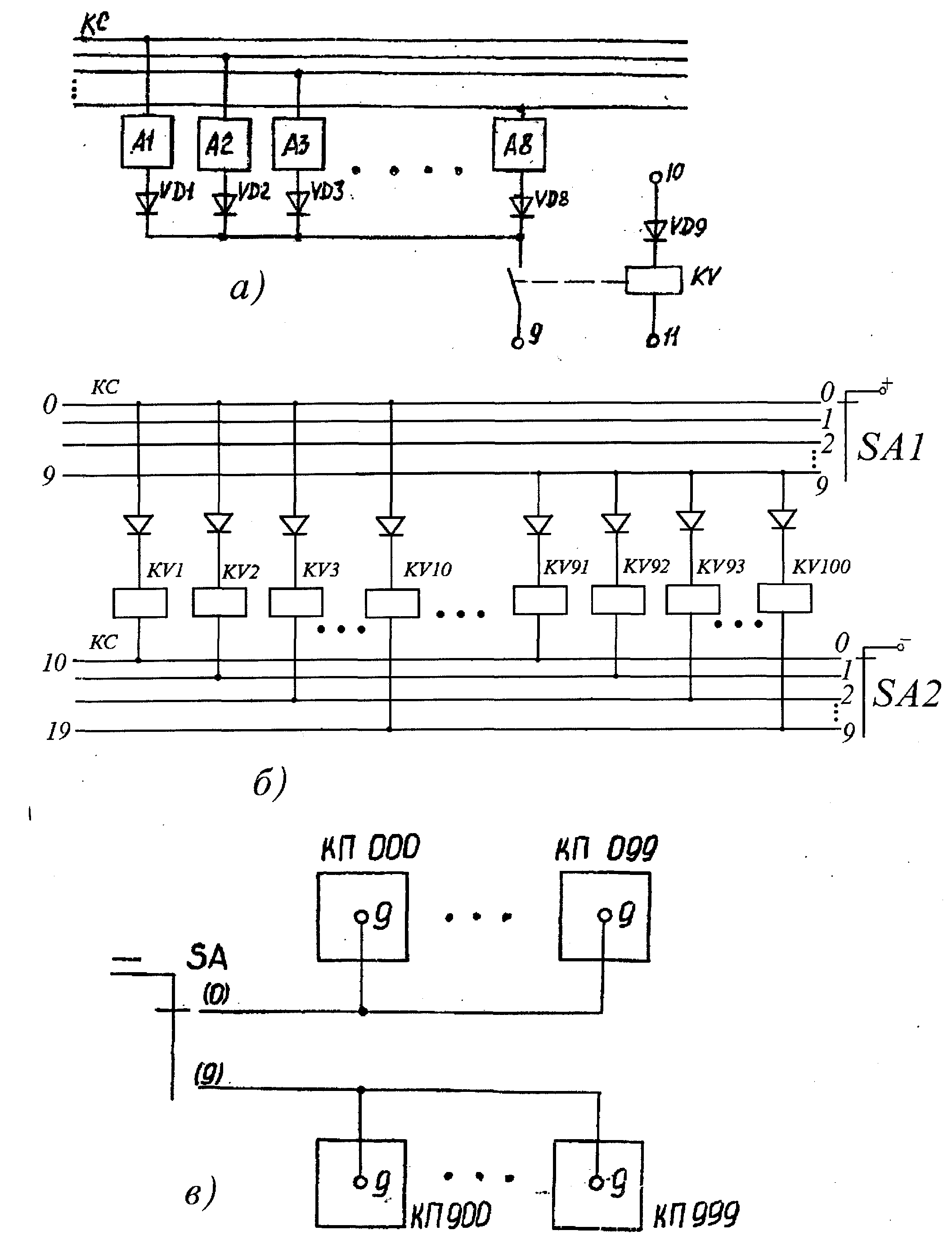 Система работает следующим образом. Сначала выбирается КП, а затем сам объект телеуправления или телеизмерения. Подключение объектов на КП к каналу связи с ПУ производится с помощью выносных коммутаторов (ВК), включающих в себя (рисунок 12.4а) разделительные диоды VD1–VD8, включенных последовательно с катушками исполнительных реле и измерительными преобразователями, и линейного реле KV.