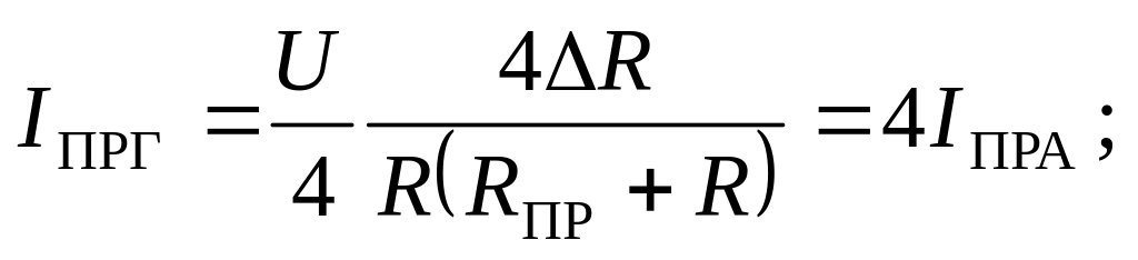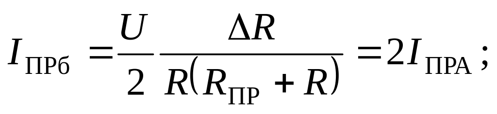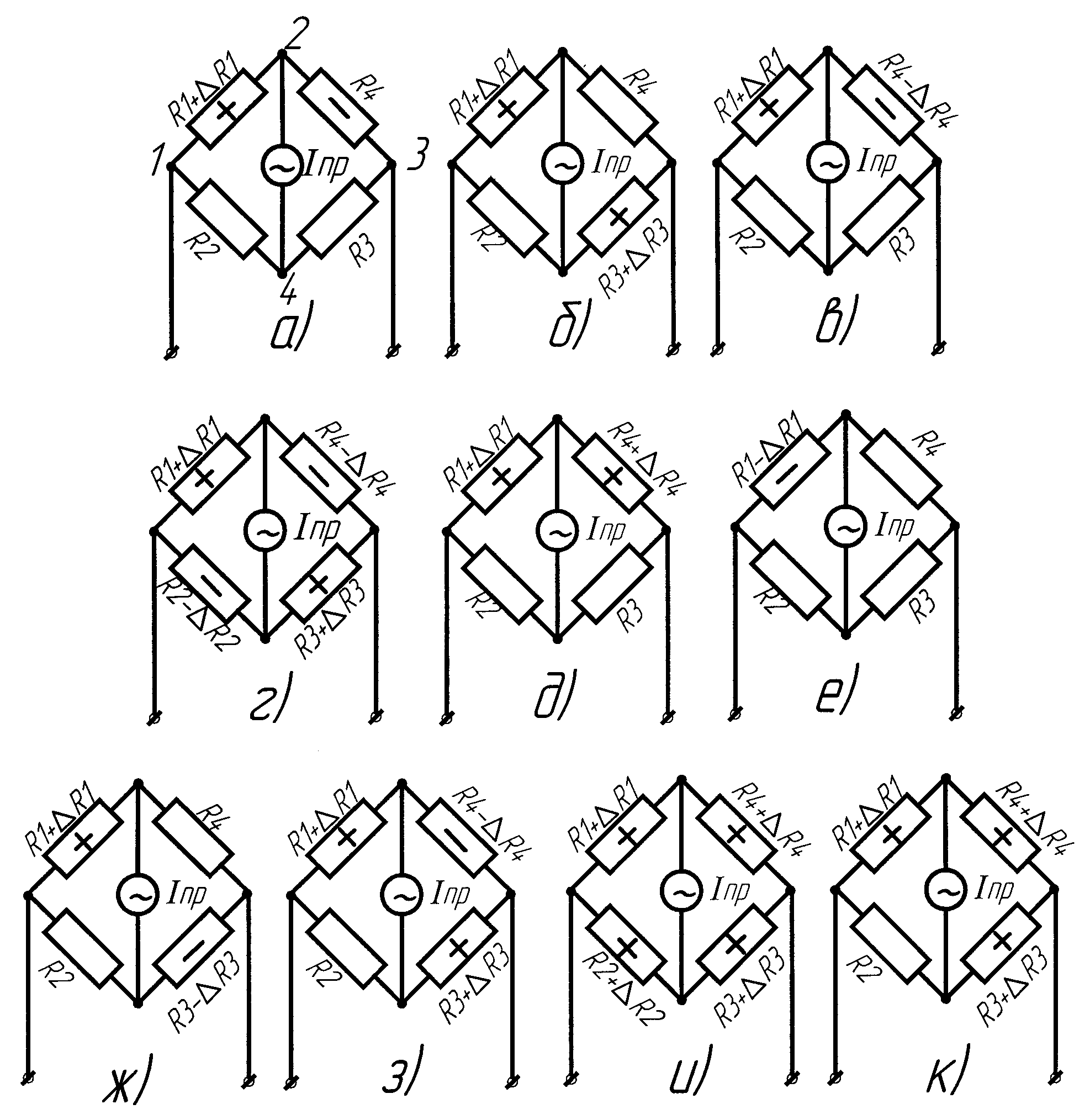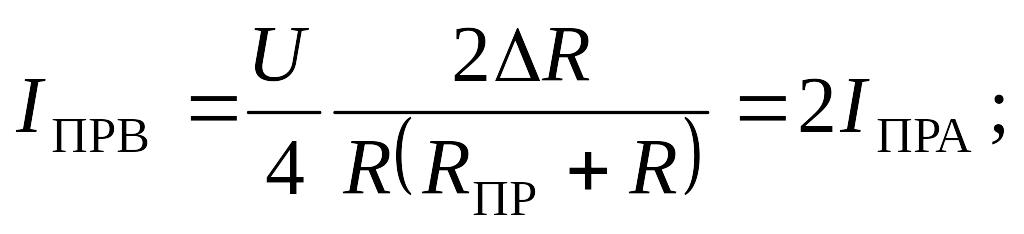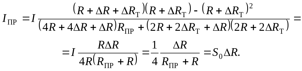 Допустим, что мост предварительно сбалансирован, т. е. IПР = 0. Под влиянием измеряемой величины сопротивление тензорезистора изменяется на величину +∆R1 (растяжение). Кроме того, в результате нагревания детали, на которую наклеен тензорезистор, его сопротивление увеличивается на величину +∆R1Т. Остальные резисторы должны иметь ту же температуру, что и рабочий. Обычно для схемы моста выбираются резисторы с Rl = R2 = R3 = R4 = R. Тогда для схемы 2.2а можно записать: