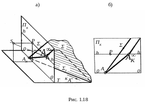 На картинной плоскости ΠK (рис. 1.19, б) показана построенная перспектива плоскости Σ, перпендикулярной к предметной плоскости T.