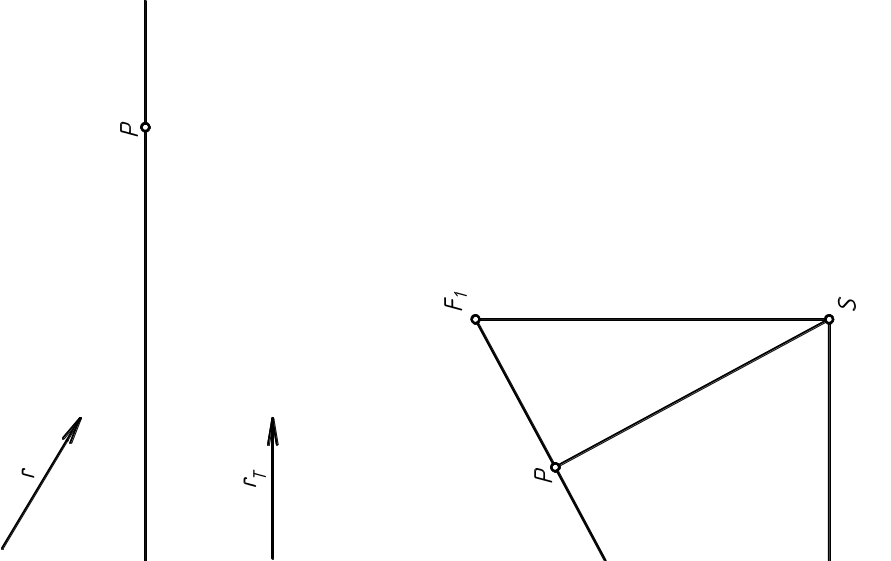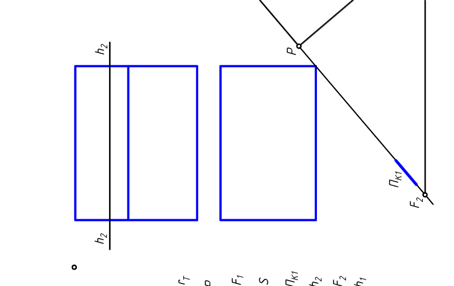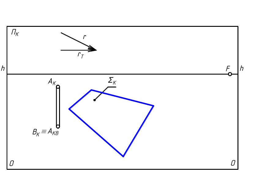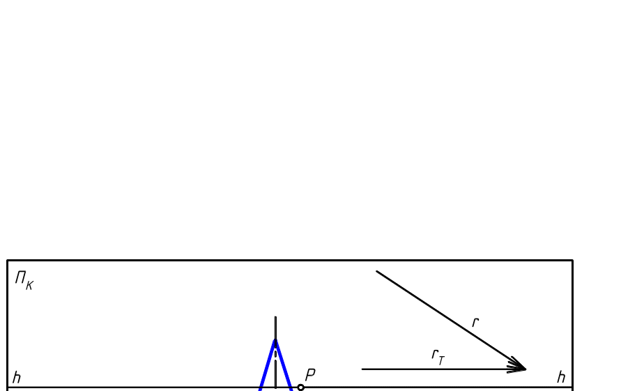 На картинной плоскости ПК заданы направления лучей света r и их вторичных проекций rТ при параллельном освещении слева.