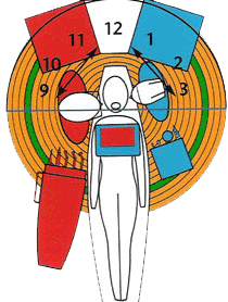 Автор методики работы "в четыре руки" (Kimmel et al.) использует концепцию разделения рабочих пространств между стоматологом и ассистентом. Рабочие пространства можно разделить по аналогии с циферблатом. Центром циферблата условно рассматривается голова пациента (лоб – 12 часов, подбородок 6 часов, левое ухо 3 часа, правое ухо 9 часов).