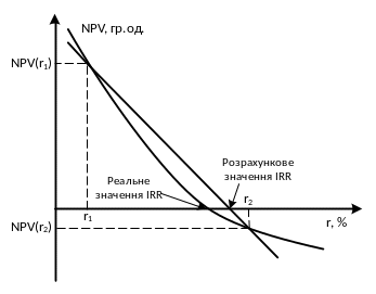 Графический метод определения IRR. Для определения IRR рассчитывают два значения NPV, меняя ставку дисконтирования (r) таким образом, чтобы один результат вычислений был положительным, а второй отрицательным. Причем чем ближе полученные значения показателя к нулю, тем выше будет точность вычислений. Рассчитанные значения NPV откладываются на графике (рис. 1), после чего соединяются прямой линией. Точка пересечения проложенной линии и оси абсцисс и будет отражать значение IRR, близкое к реальному.