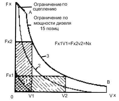 Максимальное значение силы тяги ограничивается силой сцепления колесных пар с рельсами, а максимальное значение скорости — условиями безопасности. Таким образом, в условиях, когда дизель имеет постоянную частоту вращения и неизменяющийся вращающий момент, а колесные пары частоту вращения от нуля до определенного максимального значения, от передачи требуется непрерывное плавное изменение передаточного отношения, и это изменение должно совершаться автоматически в соответствии с требуемой силой тяги тепловоза (рис. 1).