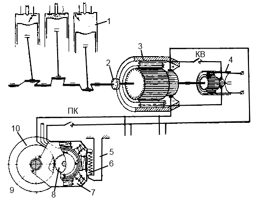 1 - дизель; 2 - соединительная муфта; 3 - тяговый электрический генератор; 4 - возбудитель генератора; 5 - рама тележки; б - пружинная подвеска двигателя на раме тележки; 7 - тяговый электродвигатель; 8 - шестерня; 9 - зубчатое колесо; 10 - колесная пара; КВ - контактор возбуждения; ПК - поездной контактор тепловоза.
