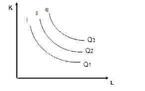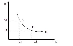 Рассмотрим графическое представление производственной функции. Графиком двухфакторной функции Q = f (L,K) является изокванта, которая представляет собой линию постоянного уровня выпуска. Т.е. изокванта - есть кривая равного продукта или множество возможных комбинаций факторов труда и капитала, при котором достигается один и тот же выпуск продукции.
