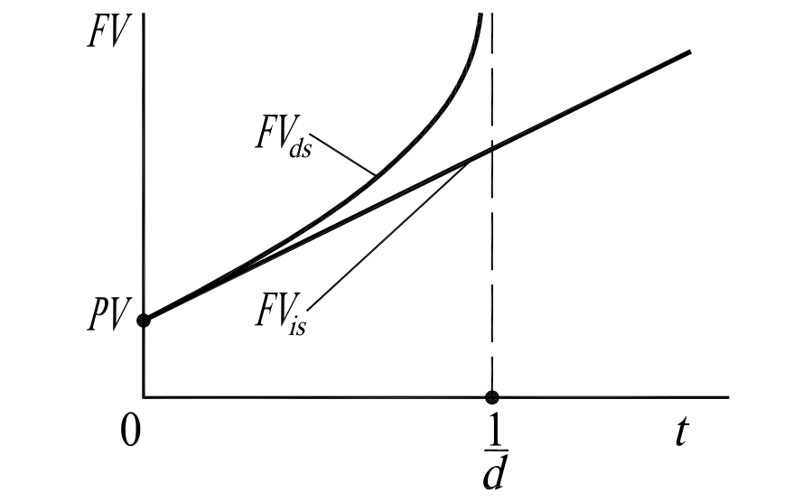 Формула (2.18) показывают, что зависимость суммы начисленных процентов I от продолжительности ФО t нелинейная (см. рис. 2.3, 2.4). Формула также показывает, что, в отличие от наращения по простой процентной ставке i, проценты, начисленные по простой учетной ставке d за очередной период начисления, выше, чем за предшествующий период, равный ему по продолжительности [2].