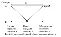 Пусть станция А в некоторый момент времени начинает передачу. Прежде, чем сообщение со станции А поступит на станцию В, последняя решает начать передачу. Это приведет к возникновению конфликта, который обнаружится станцией А только лишь через с.