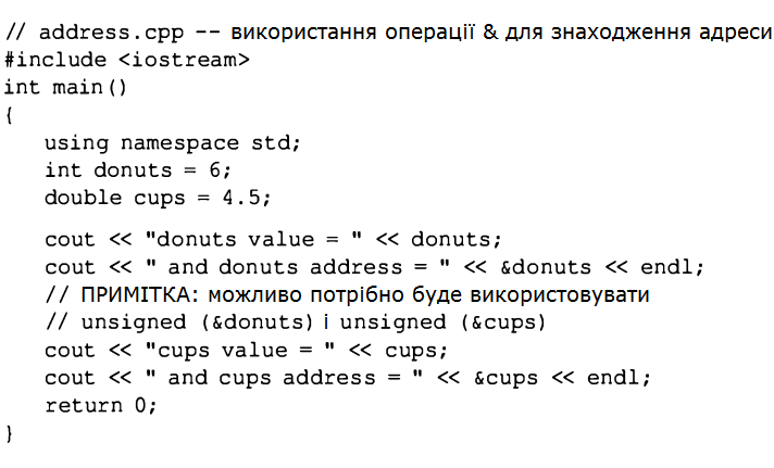 У показаній тут конкретній реалізації cout використовується шістнадцяткова нотація при відображенні значень адрес, тому це звичайна нотація, застосовувана для вказання адрес пам'яті. (Деякі реалізації застосовують десяткову нотацію.) Наша реалізація зберігає donuts в пам'яті з меншими адресами, ніж cups. Різниця між цими двома адресами становить 0x0065fd44-0x0065fd40, або 4 байти. Звичайно, в різних системах ви отримаєте різні значення цих адрес. До того ж деякі системи можуть зберігати cups перед donuts, і різниця між адресами складе 8, тому що cups має тип double. Інші системи можуть навіть розмістити ці змінні в пам'яті далеко один від одного, а не поруч.