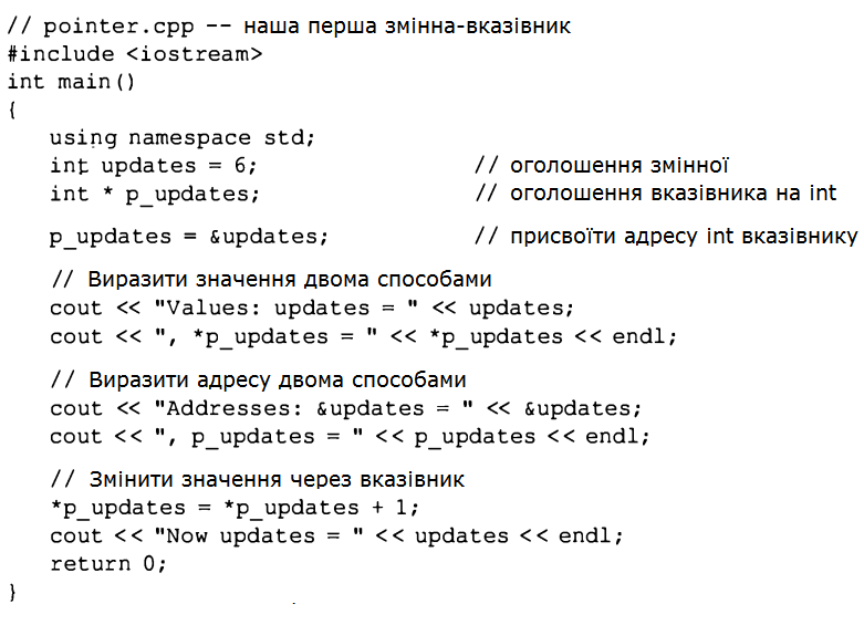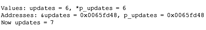 Як бачите, змінна updates типу int і змінна-вказівник p_updates - це дві сторони однієї монети. Змінна updates в першу чергу представляє значення, а для отримання його адреси використовується операція &, в той час як p_updates представляє адресу, а для отримання значення застосовується операція * (мал. 7) Оскільки p_updates вказує на updates, конструкції *p_updates і updates повністю еквівалентні. Ви можете використовувати *p_updates точно так само, як використовуєте змінну типу int. Як показано в прикладі з лістингу 13, можна навіть присвоювати значення *p_updates. Це змінює значення вказаної змінної - updates.