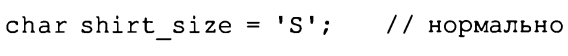 Зверніть увагу, що рядкова константа (в подвійних лапках) не взаємозамінна з символьної константою (в одинарних лапках). Символьна константа, така як 'S' - скорочене позначення для коду символу. В системі ASCII константа 'S' - це просто інший спосіб запису коду 83. Тому наступний оператор привласнює значення 83 змінній shirt_size:
