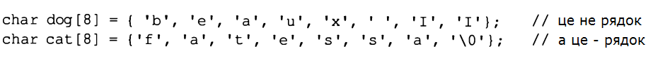 Обидві ці змінні є масивами char, але тільки другий з них є рядком. Нульовий символ грає фундаментальну роль в рядках стилю С. Наприклад, в C++ є безліч функцій для обробки рядків, включаючи ті, що використовуються cout. Всі вони обробляють рядки символ за символом доти, поки не зустрінеться нульовий символ. Якщо ви просите об'єкт cout відобразити такий рядок, як cat з попереднього прикладу, він виводить перших сім символів, виявляє нульовий символ і на цьому зупиняється. Однак якщо ви раптом вирішите вивести в cout масив dog з попереднього прикладу, який не є рядком, то cout надрукує вісім символів з цього масиву і продовжуватиме рухатися по пам'яті, байт за байтом, інтерпретуючи кожен з них як символ, що підлягає висновку, поки не зустріне нульовий символ. Оскільки нульові символи, які, по суті, являють собою байти, що містять нулі, зустрічаються в пам'яті досить часто, помилка зазвичай виявляється швидко, але в будь-якому випадку ви не повинні трактувати нерядкові символьні масиви як рядки.