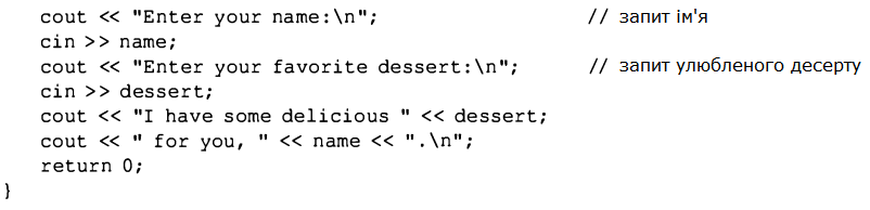 Призначення програми з лістингу 3 просте: прочитати ім'я користувача і назву його улюбленого десерту, введені з клавіатури, і потім відобразити цю інформацію.