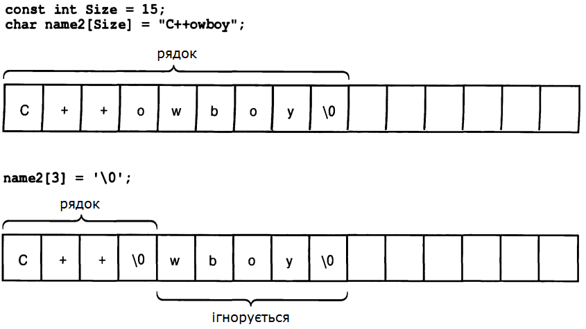 Оскільки name1 і name2 - масиви, для доступу до окремих символів в цих масивах можна використовувати індекси. Наприклад, у програмі для пошуку першого символу масиву name1 застосовується name1[0]. Крім того, програма присвоює елементу name2[3] нульовий символ. Це завершує рядок після трьох символів, хоча в масиві залишаються ще символи (мал. 3).