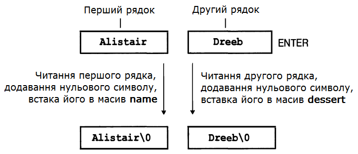 Практичний результат цього прикладу полягає в тому, що cin читає слово Alistair як повний перший рядок і поміщає його в масив name. При цьому друге слово, Dreeb, залишається у вхідній черзі. Коли cin шукає введення, що відповідає на питання про десерт, він знаходить там Dreeb. Потім cin захоплює слово Dreeb і поміщає його в масив dessert (мал. 4).