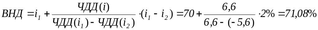 Определим внутреннюю норму доходности системы контроля качества (Internal rate of return, IRR - ВНД). Будем искать интервал изменения уровня банковской процентной ставки i, в пределах которого чистая дисконтированная стоимость ЧДД меняет знак.