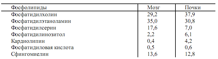 Таблица 3. Содержание фосфолипидов и сфингомиелина в мозгу и почках человека