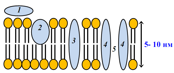 Рис.5. Жидко-мозаичная модель мембраны. 1 – поверхностные белки; 2 – полупогруженные белки; 3 –погруженные или интегральные белки; 4 – белки, формирующие ионный канал; 5-ионный канал.