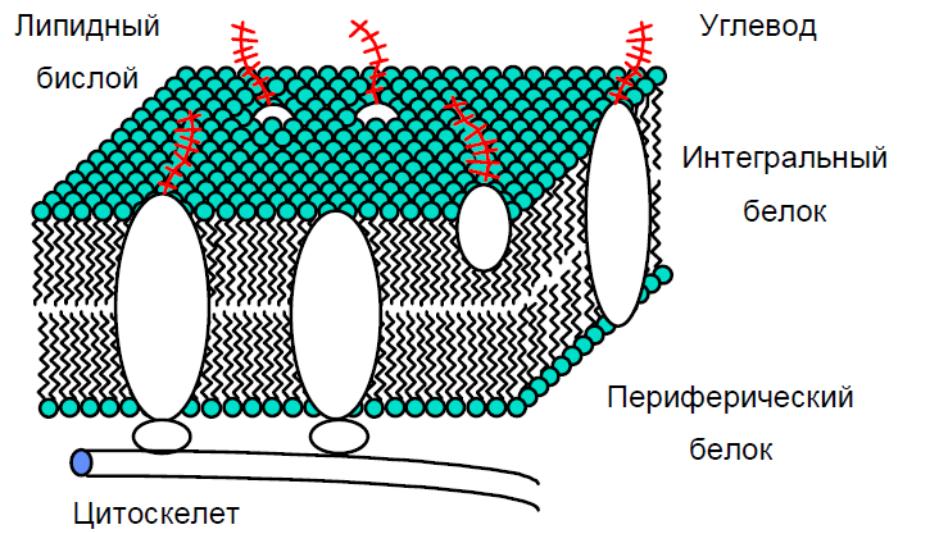 Согласно современным представлениям, все клеточные и внутриклеточные мембраны устроены сходным образом: основу мембраны составляет двойной молекулярный слой липидов (липидный бислой), на котором и в толще которого находятся белки (рис.1). В липидный бислой встроены белковые молекулы, придающие специфические свойства различным участкам мембран, и тем самым, позволяющие последним принимать участие в разнообразных метаболических процессах.